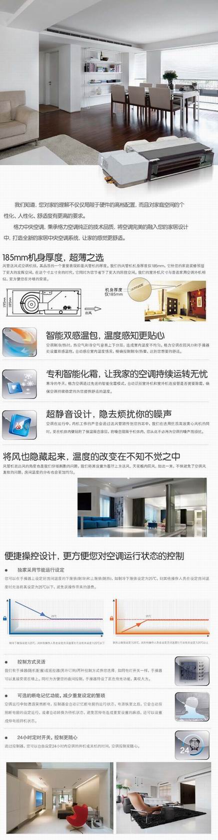 特點:與普通分體式空調(diào)相比較,家用中央空調(diào)有著無可比擬的優(yōu)勢,(從節(jié)能上說家用中央空調(diào)直流變頻的基本能效都在國家一級以上,隱藏式風(fēng)管機能效比基本都在二級以上)它們內(nèi)機有 擁有嵌入式、卡式、吊頂內(nèi)隱藏式 落地式等十幾種樣式,每種樣式又有許多型號相對應(yīng),送風(fēng)方式可供選擇的方案要多達(dá)數(shù)百種。這就給用戶提供了很多選擇機會。它還有許多與室內(nèi)裝修相配的裝修方案供用戶選擇,能夠真正滿足用戶的個性化需求。